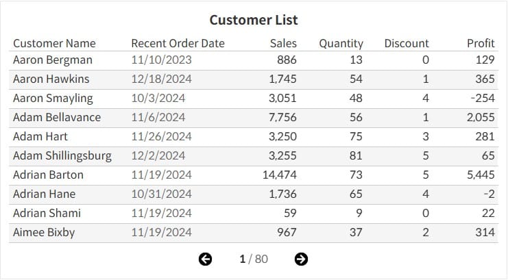 Last Page: 고객 수를 기준으로 최대 페이지 수를 계산합니다. 데이터의 고객 수는 793명으로 80페이지까지 표시될 수 있습니다.Previous: 파라미터를 기준으로 하나 적은 값을 가지고 있도록 설정합니다. 1페이지 이전의 값은 존재할 수 없으므로 동일한 1 값을 전달하도록 설정합니다.Next: 파라미터를 기준으로 하나 많은 값을 가지고 있도록 설정합니다.Last Page이후의 값은 존재할 수 없으므로 동일한Last Page값을 전달하도록 설정합니다.