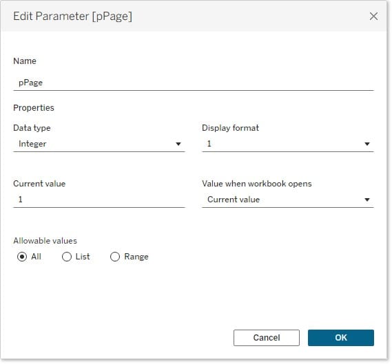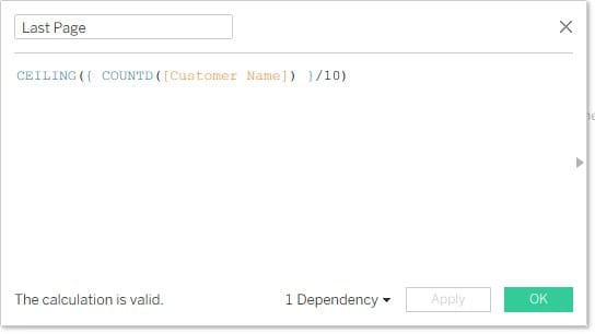 - 생성한 파라미터를 기준으로 페이지를 구분할 계산식을 만들어줍니다. 이번 예제에서는 고객 목록이 10개씩 표시되도록 설정하겠습니다.
