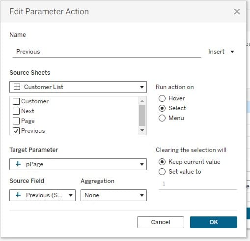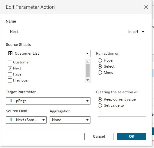 - 대시보드 동작으로 파라미터의 값을 변경할 수 있도록 설정합니다.