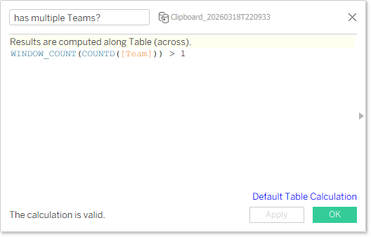 두 번째 차원의 고유 항목 수를 세어, 그 값이 1보다 큰지 확인하는 논리형(T/F) 계산된 필드를 생성합니다.WINDOW_COUNT(COUNTD([두 번째 차원명])) > 1