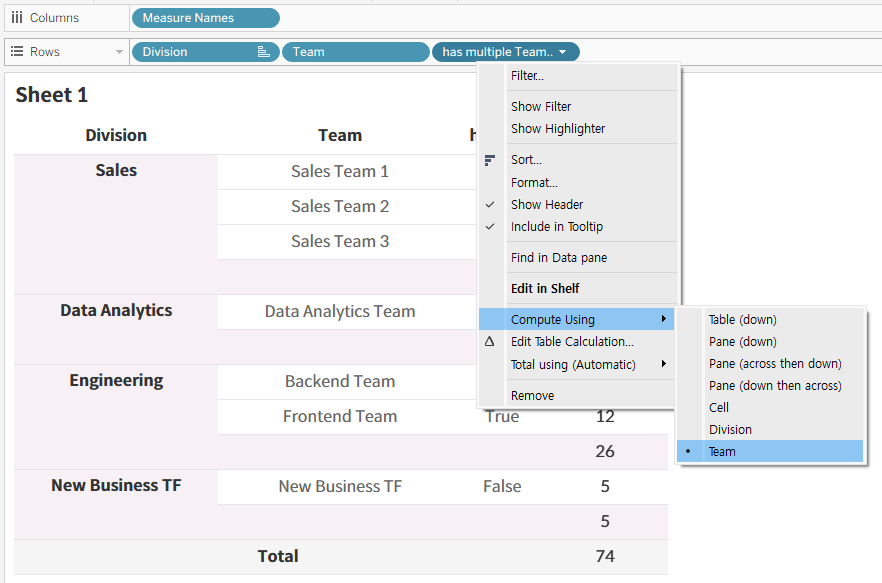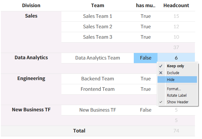 - 마지막으로 행 선반에 있는 계산된 필드를 우클릭하고 [머리글 표시]를 체크 해제하여 화면에서 해당 열이 보이지 않도록 정리합니다.