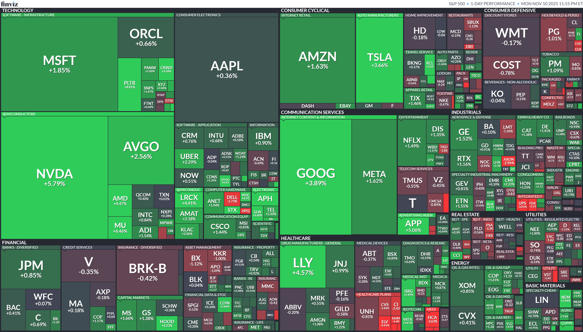 이러한 색상 대비의 대표적인 사례가 바로 S&P 500 Map입니다. 각 기업의 시가총액을 면적으로, 주가 등락률을 색상으로 표현하여 시장 전체의 흐름을 한눈에 보여주는 구조입니다.