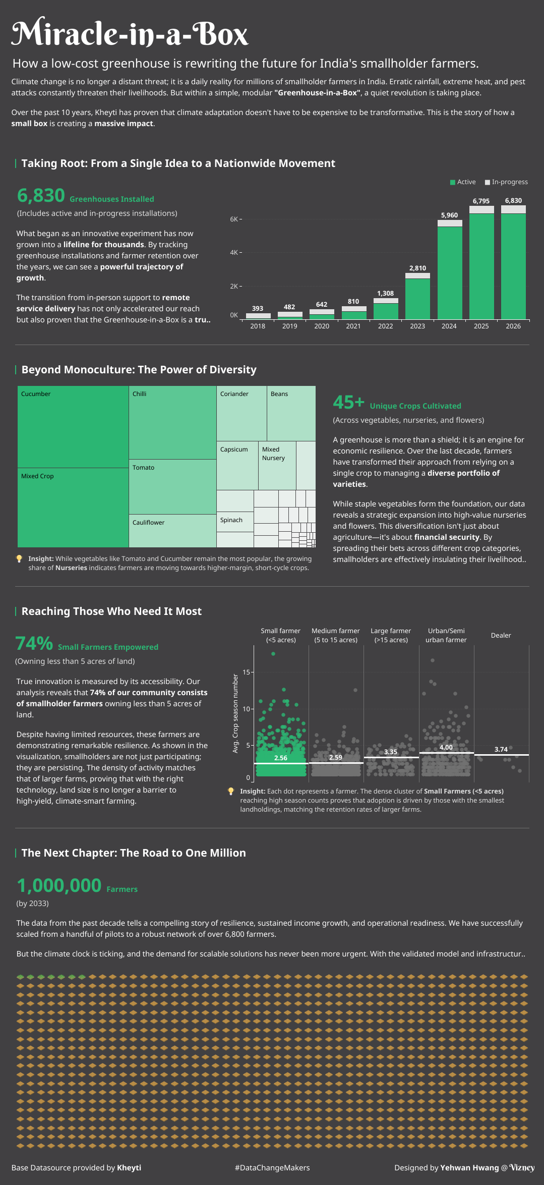 인도의 농업 혁신 스타트업 'Kheyti'의 온실 키트가 농부들의 삶을 어떻게 변화시켰는지를 다룬 대시보드입니다. 문제 상황에서부터 해결책이 적용된 결과까지의 과정을 스크롤 흐름에 담아, 데이터 뒤에 숨겨진 사회적 가치와 감동을 전달하고자 했습니다.